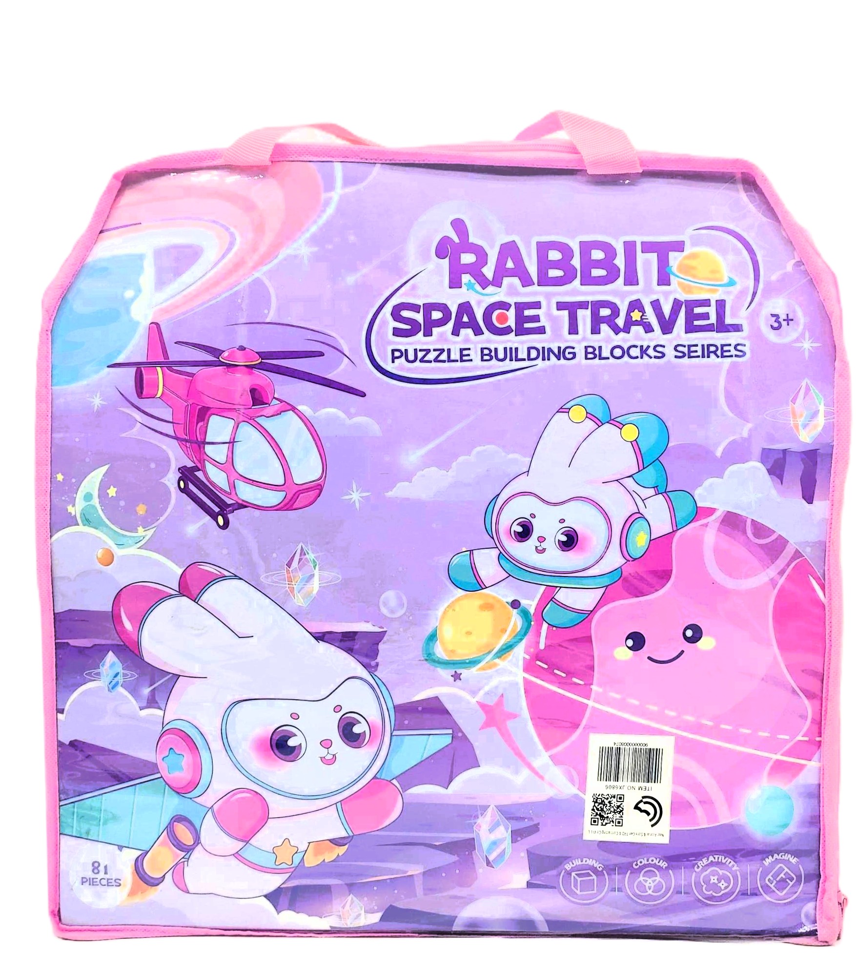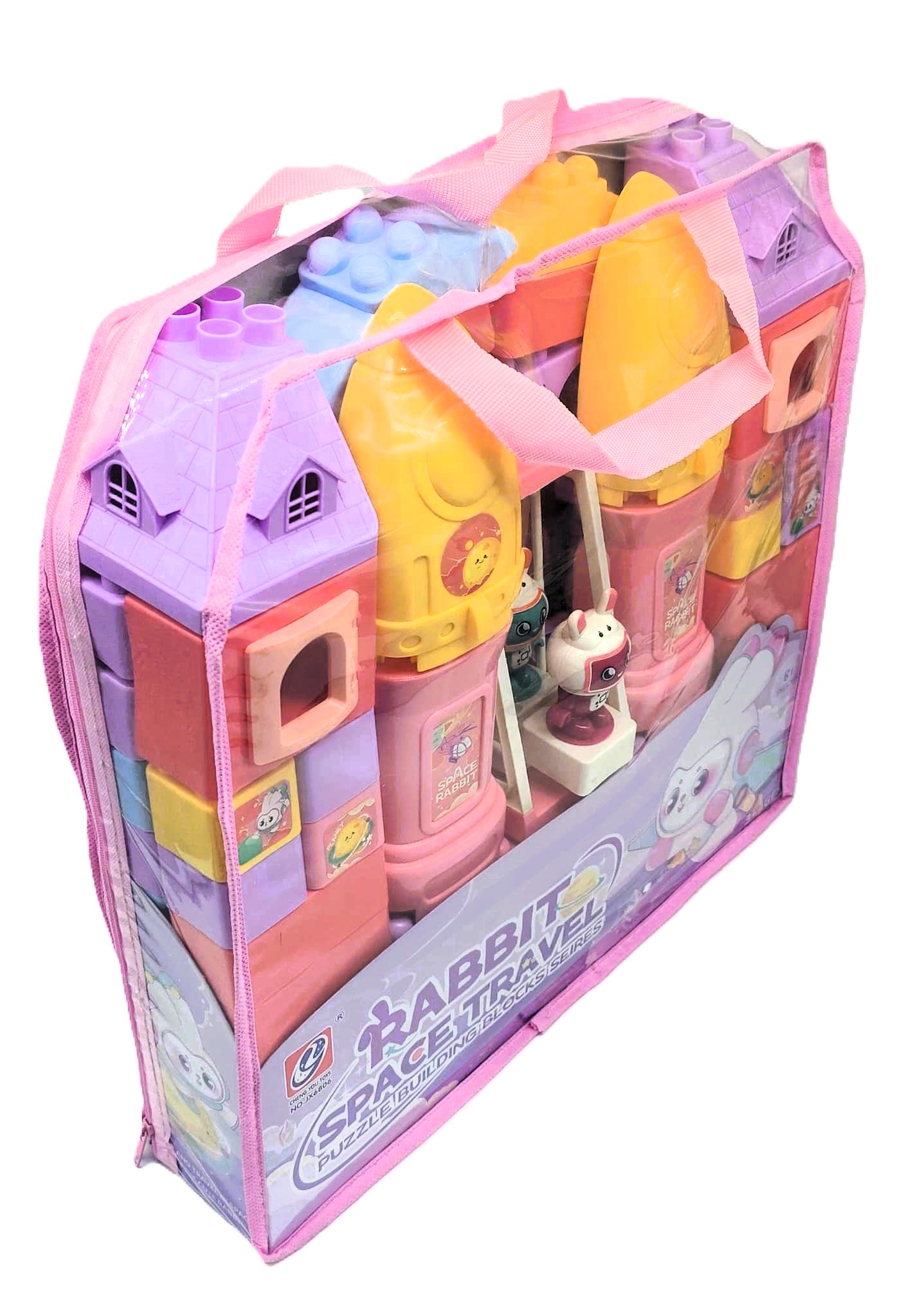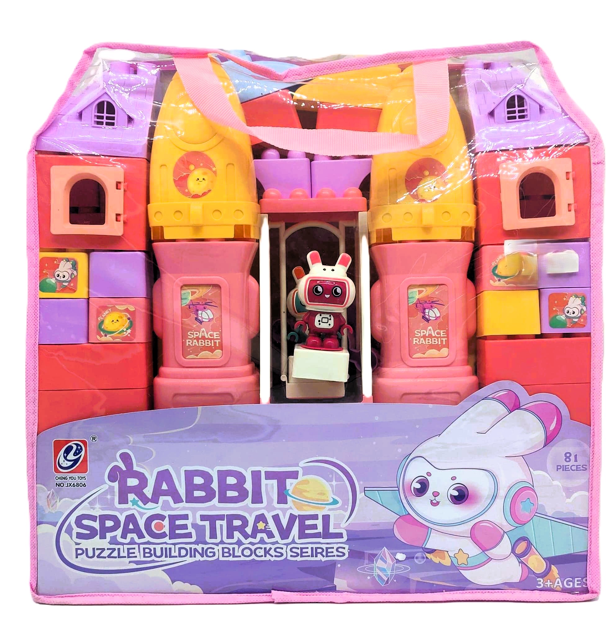 Take your imagination on a cosmic journey with the expanded 81-Piece Rabbit Space Travel Puzzle Blocks Set! Packaged in a durable, clear tote bag with convenient pink carry handles, this adorable space-themed building kit is perfect for on-the-go galactic missions, playdates, and easy clean-up.