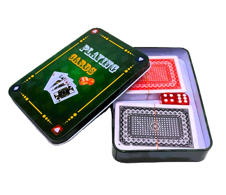 Protective Storage Tin: The elegant green metal tin features a classic casino-style graphic with card suits, dice, and gold accents. It provides a secure, travel-friendly storage solution to keep your cards from bending and your dice from getting lost.