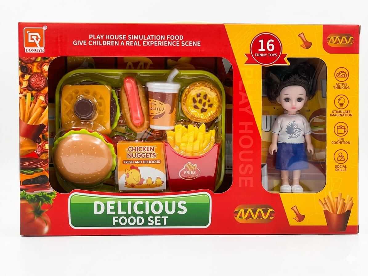 Comprehensive 16-Piece Set: Includes a variety of food items such as a realistic hamburger, chicken nuggets box, French fries, a hot chocolate cup, pizza, and an adorable fashion doll.