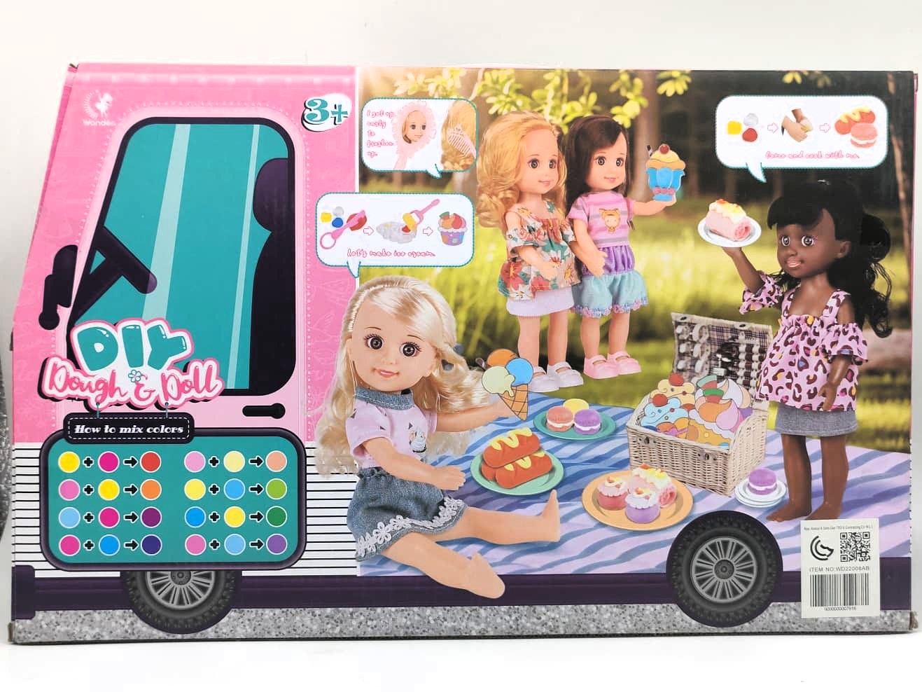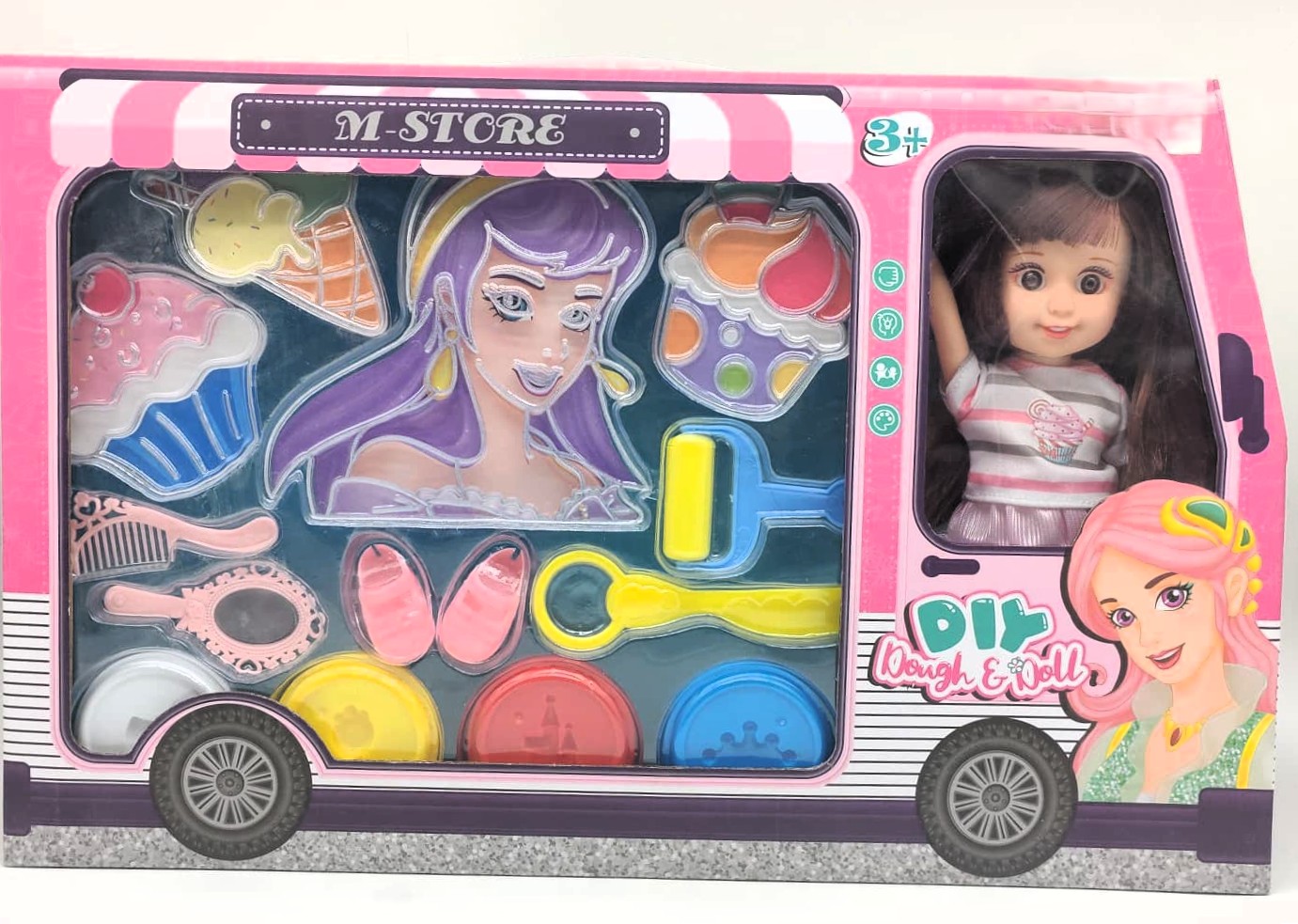 Step into the world of creative culinary play with the DIY Dough & Doll M-Store! This all-in-one playset, designed as a charming pink picnic van, combines doll roleplay with the hands-on fun of dough modeling. The set features a beautiful fashion doll with long, brushable hair and a variety of salon accessories, including a play mirror and comb.