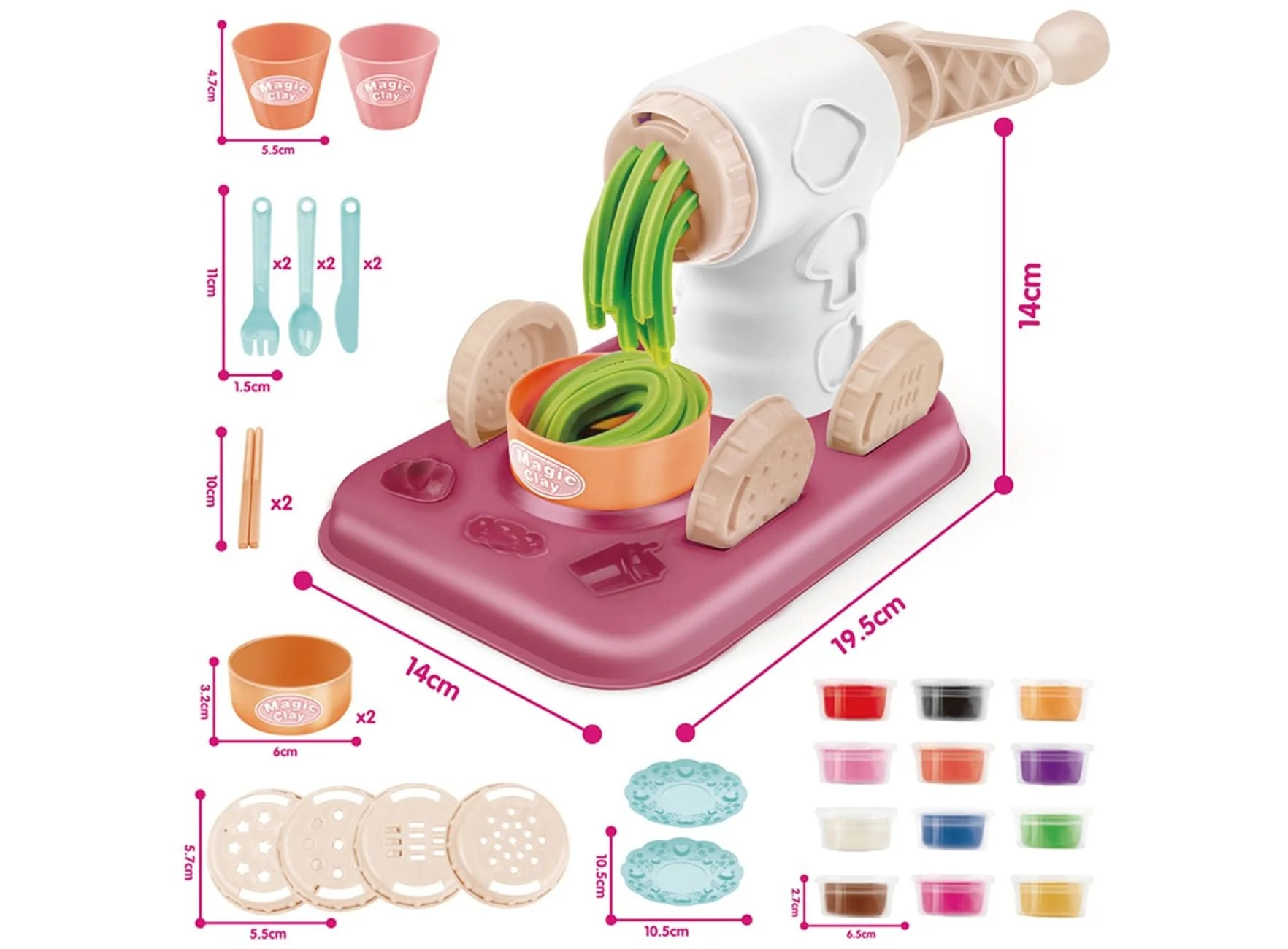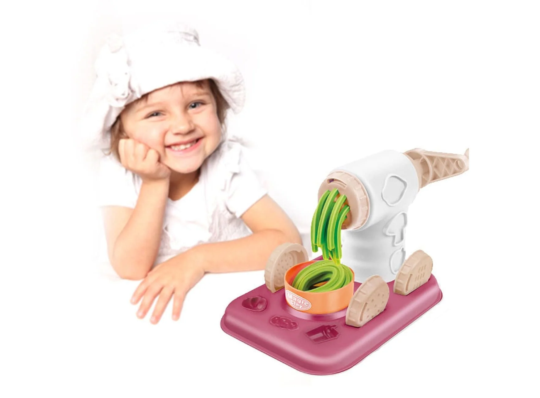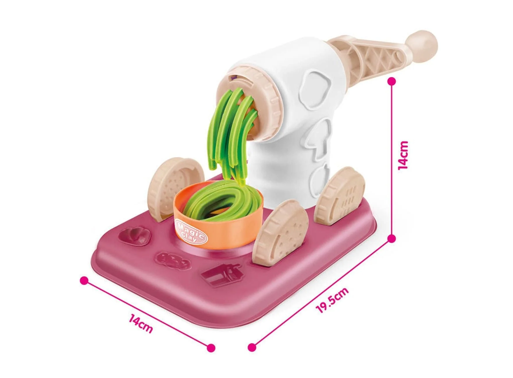 • Interactive Hand-Crank Extruder: The heart of the set is a powerful, easy-to-use crank machine. By simply switching the front discs, kids can squeeze out long “spaghetti” noodles, flat “linguine,” or thick “frosting” for their clay desserts.