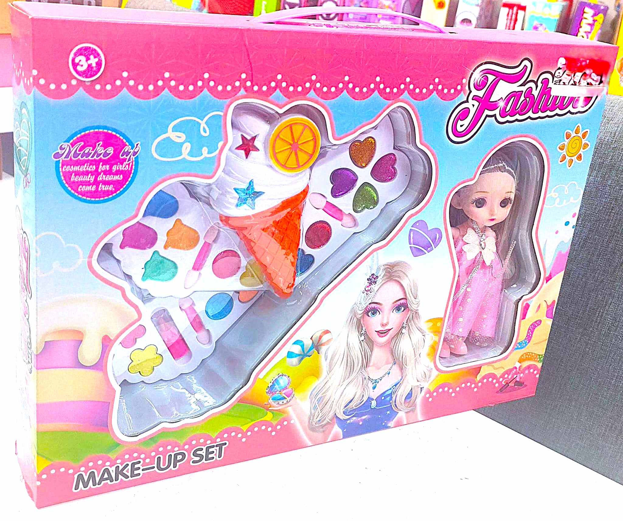 The set features a clever 3-tier palette shaped like a colorful ice cream cone, packed with a vibrant assortment of makeup. As a special bonus, it includes a charming princess doll in a pink dress, making it the ultimate gift for any young fashionista.
