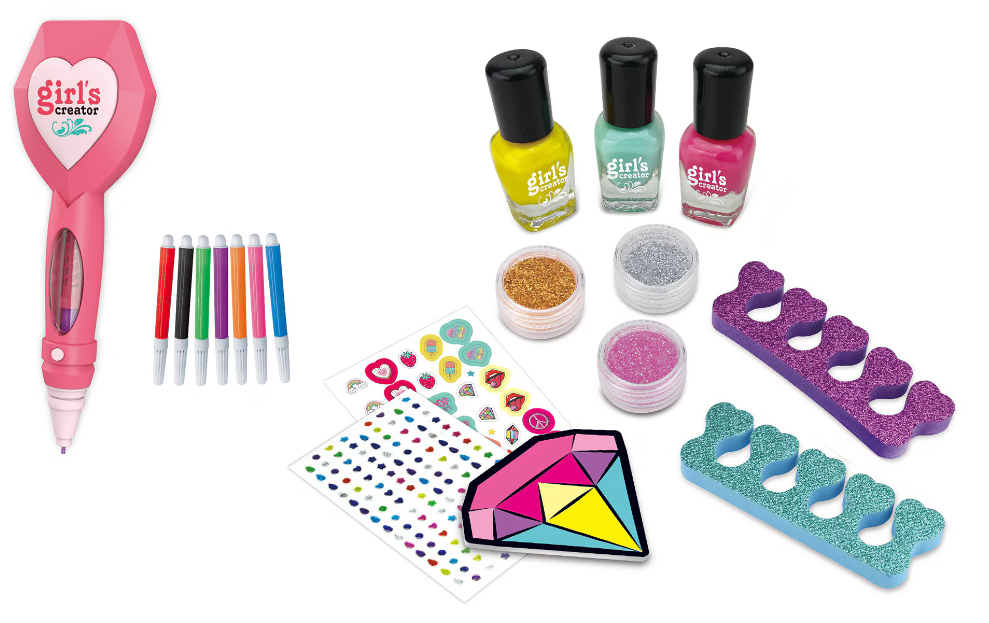 Let your child’s creativity shine with the Girl’s Creator 2-in-1 Tattoo Art & Nail Art Studio! This ultimate dual-purpose beauty kit provides endless hours of creative fun, allowing young stylists to express themselves safely. The set features a unique, battery-operated Electronic Tattoo Pen that works perfectly with the 7 included vibrant, washable marker pens. Kids can choose from 8 trendy stencil designs to create flawless temporary tattoos that easily wash off.