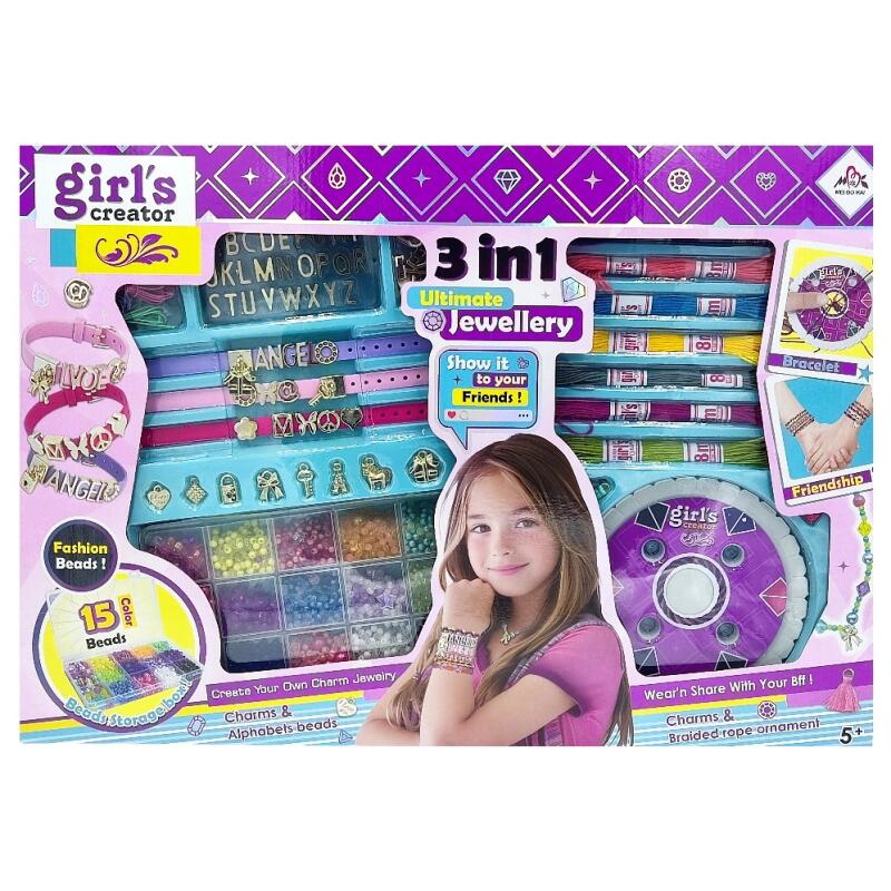 Shop the Girl’s Creator 3-in-1 Ultimate Jewellery Kit at al3aby.com! This massive DIY set for girls 5+ includes a 15-color fashion bead box, a friendship bracelet braiding loom with colorful threads, and customizable message bands with metallic alphabet charms. The perfect craft gift for creative kids to design and share!