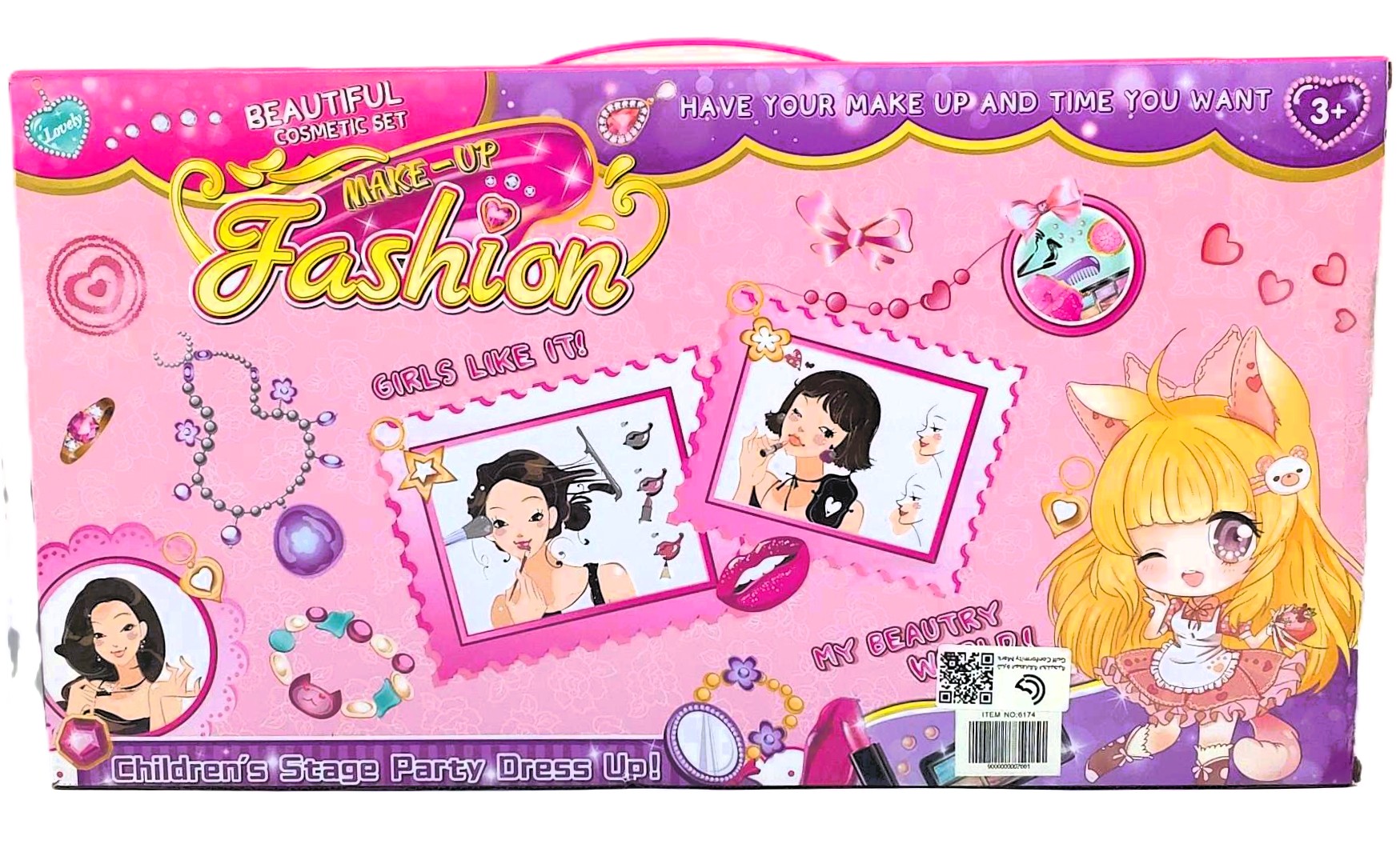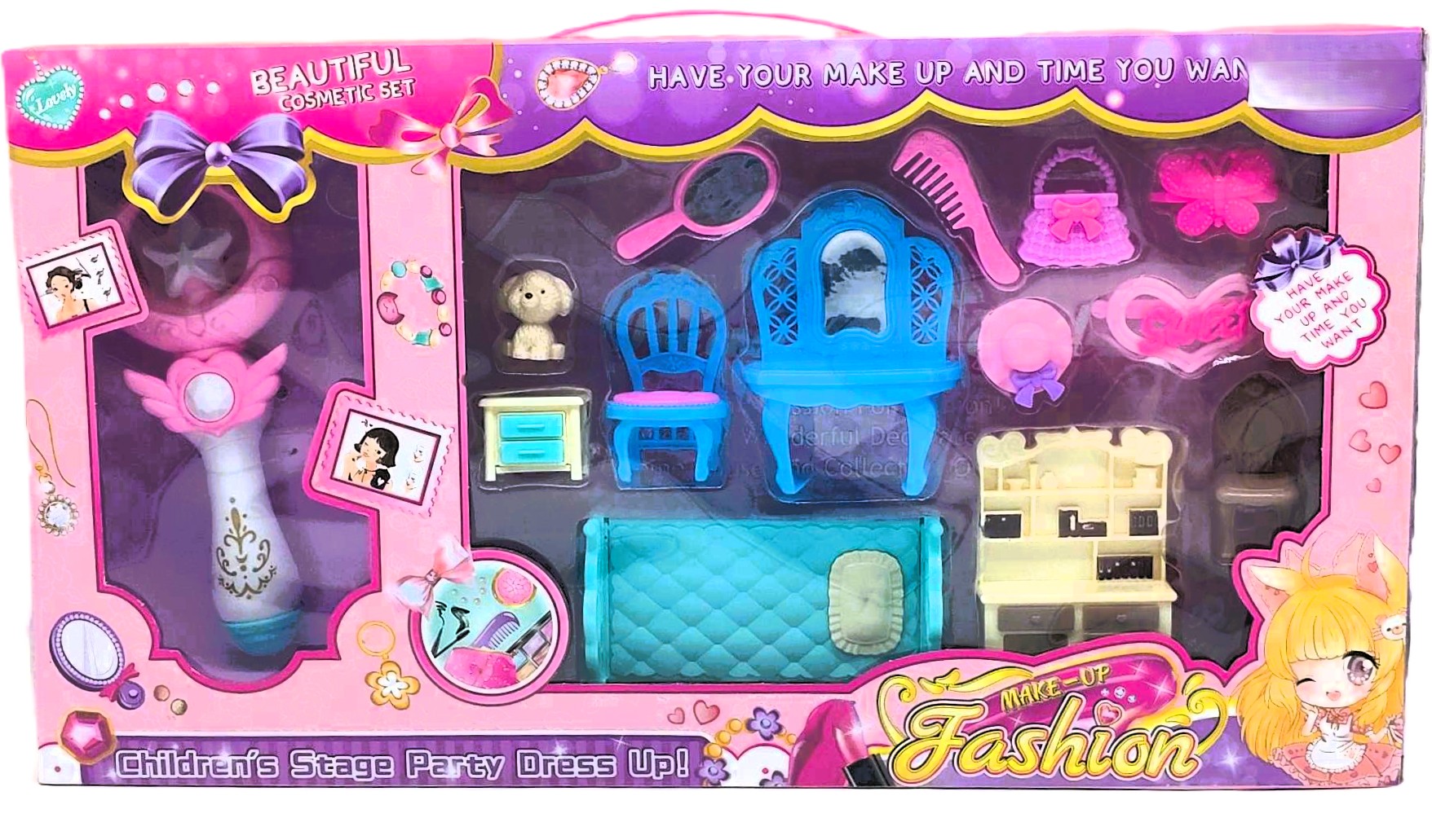 Let your child’s imagination take center stage with the Make-Up Fashion Children’s Stage Party Dress Up kit! This unique “Beautiful Cosmetic Set” combines the world of glamour with miniature storytelling. It features a magical, light-up star wand for “royal” performances and a complete bedroom furniture suite for dollhouse play.