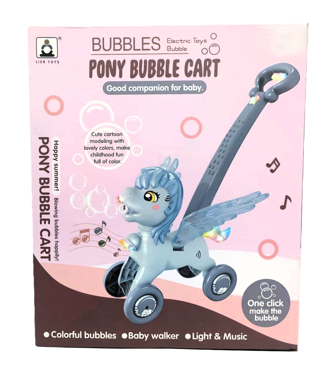 Make childhood full of color and magic with the Pony Bubble Cart! This delightful 2-in-1 toy serves as both an interactive bubble machine and a sturdy push walker, making it a “good companion for baby” during those important early developmental stages. Designed with cute cartoon modeling and vibrant colors, this winged pony brings endless joy to summer play.