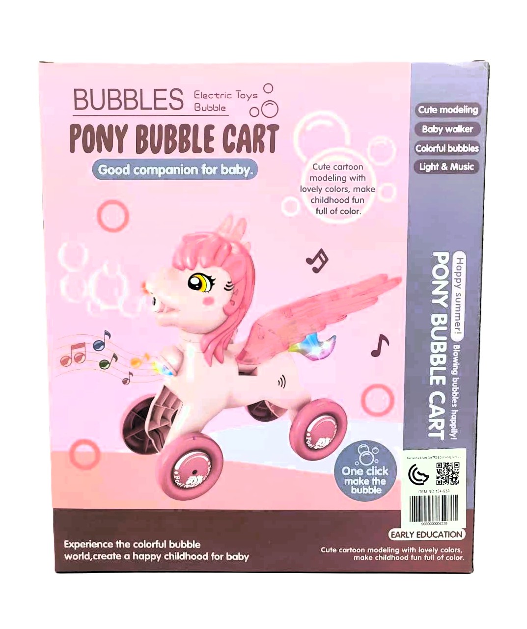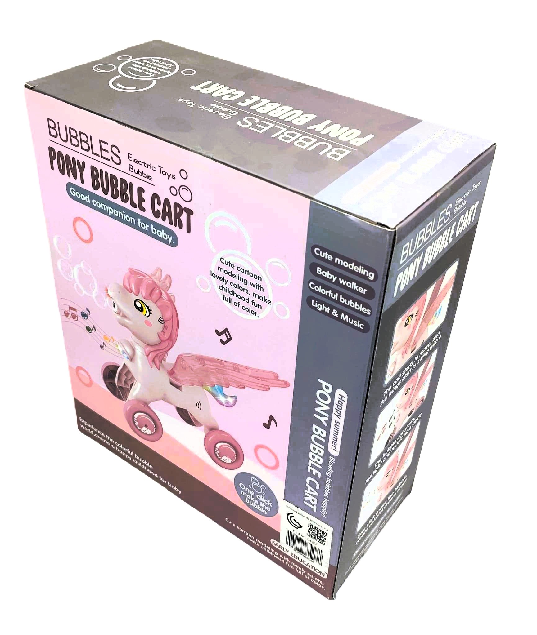 With a simple “one-click” activation, the pony starts to move its wings back and forth while blowing a steady stream of colorful bubbles from its mouth. To enhance the sensory experience, the cart features glowing multi-color lights and cheerful music that play as it moves. The long, easy-grip handle allows toddlers to push the pony along, encouraging walking and coordination. Whether used indoors or for outdoor “happy summer” fun, this electric pony creates a magical atmosphere that stimulates the imagination.