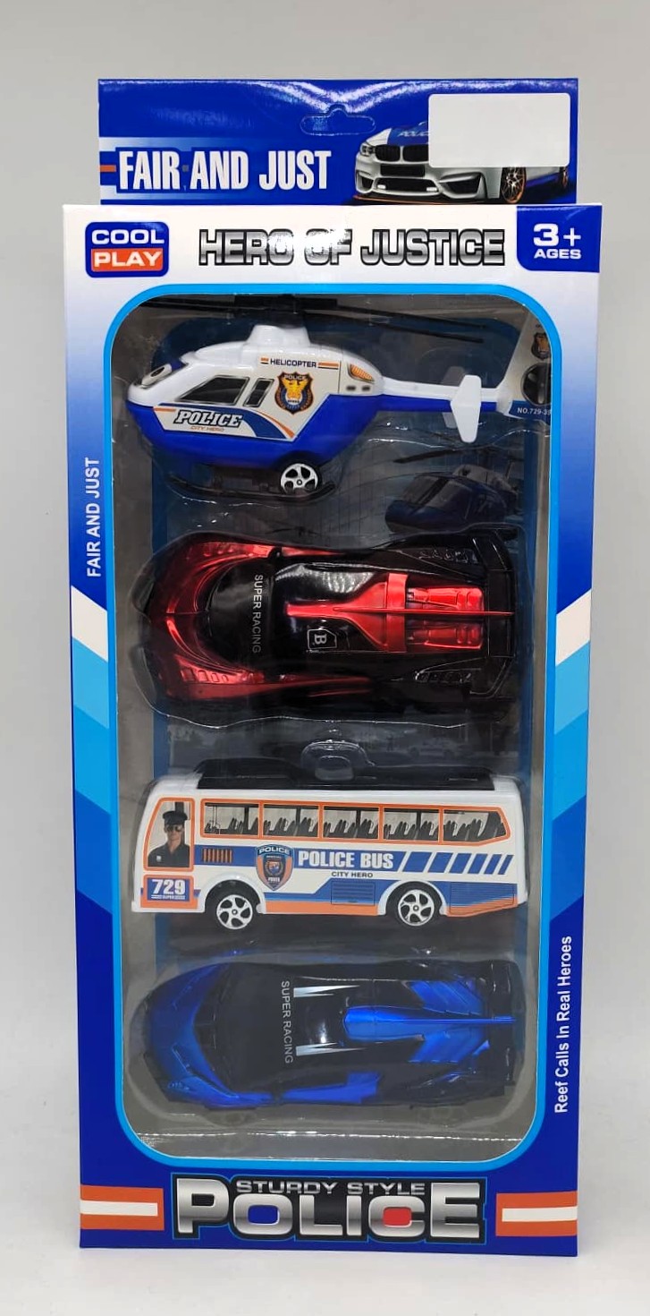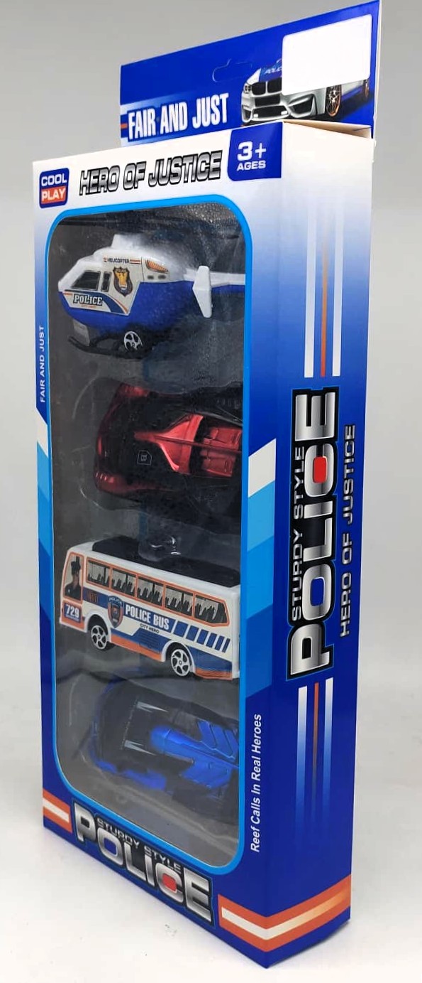 Complete Police Fleet: This exciting multipack includes four unique vehicles: a white and blue “City Hero” Police Helicopter for aerial patrols, a detailed Police Bus for transporting the squad, and two sleek “Super Racing” sports cars (one metallic red, one metallic blue) for high-speed highway pursuits.