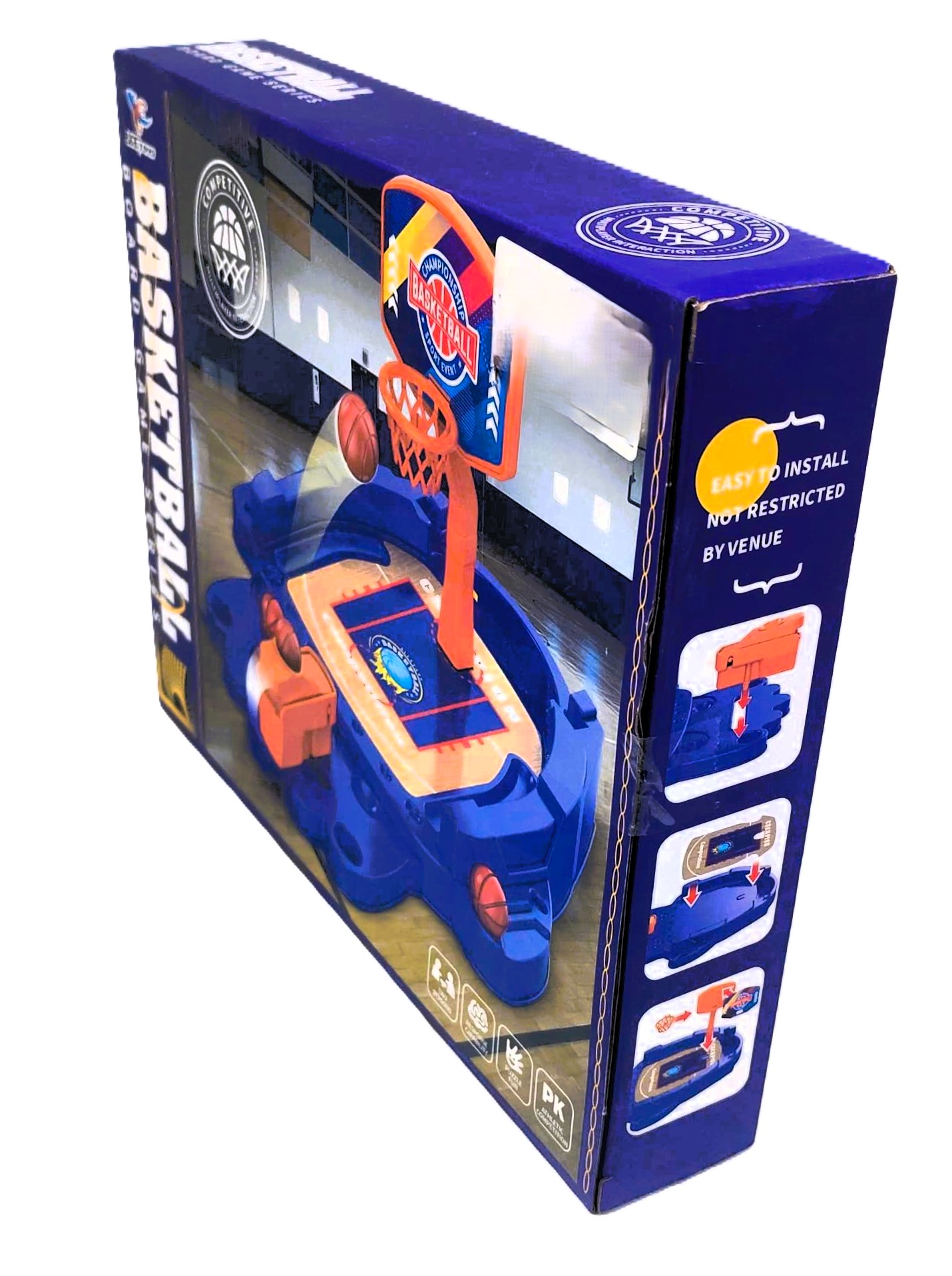 Complete Playset: Everything you need is in the box! Includes 1 sturdy blue base, 1 colorful court card, 1 adjustable launcher, 1 backboard, 1 hoop, and 4 mini basketballs.